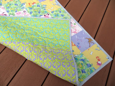 The teal above and below the black print was a Moda FQ that came to me via the thrift store.  There's a strip of hot pink scrub pants and then what was left of a vintage tropical print that I had used for the  backing on another kennel quilt.  The binding is pieced from binding scraps from the last few quilts.